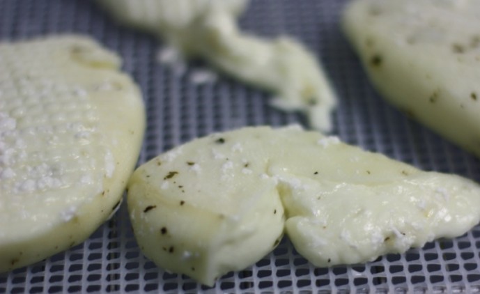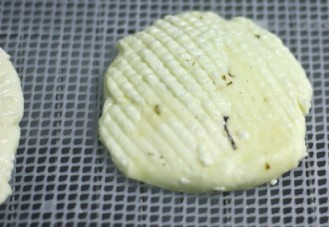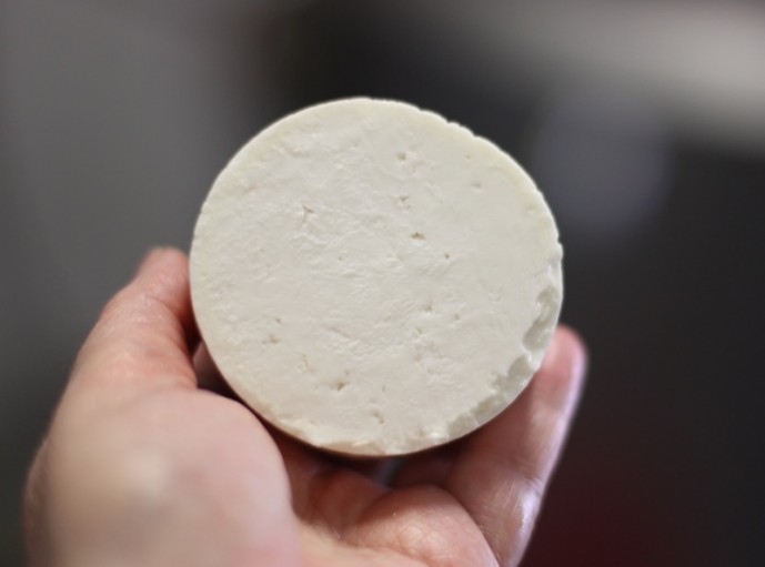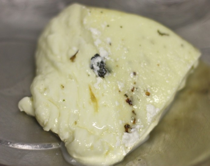 I had asked Leslie to do Halloumi and Feta Cheese for us, as our Chèvre challenge was this month, and these cheeses will be coming up soon. Below is the first ever Mint Halloumi they made, following Mary’s recipe, after it had been pressed. Now that I have made my own, I would say that their “professional press” may have been a little more than 8 pounds? I will have to ask Alex about that. I am pressing my Halloumi as I write, today, and with 8 pounds of pressure, I will get nothing like this. This Halloumi looked “absolutely gorgeous” as Lydia (one of our Australian participants) would say! But it didn’t look like any Halloumi I had ever seen…. yet!