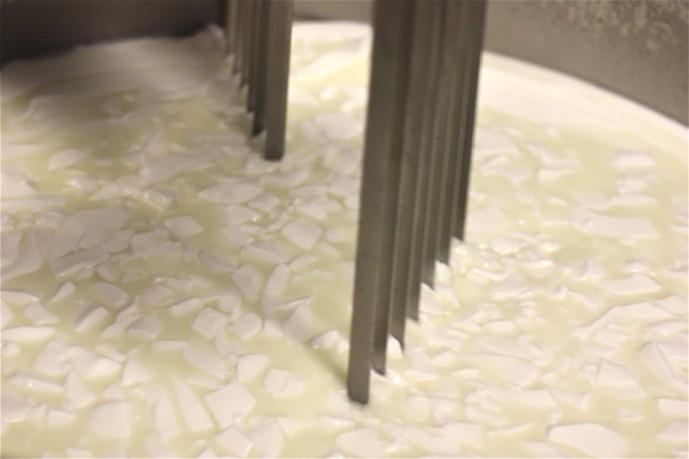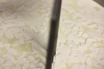 Test the curd to see if it is ready: Leslie scoops her had in. Ian just presses gently to feel it and ensure his hand comes back only with whey. It is ready. The cheese cutters are screwed into the machine and were fun to watch. Look at those gorgeous curds. I didn’t expect the cutters to be turning circles and moving in circles as they did, but it worked and didn’t take long.