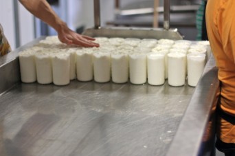 Right now, the dumping of the whey is done manually. Look at all that whey! Leslie says their coyotes are the happiest around as they get fed the best waste! This is pretty labour intensive at this point. Alex is filling and emptying buckets and buckets of whey. The machine is then tipped, to release the final amount and all of the curds have been transported to the table with many hands packing them into crottin moulds which Alex finds work perfectly for their feta.