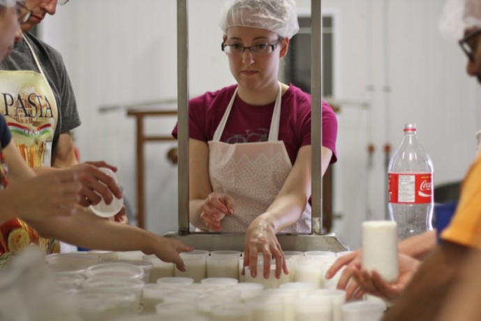 Leslie and Alex trade with vendors at the market, of course, so they were able to get a wide range of all kinds of mint to dry for this recipe. The aroma was tantalizing. In the middle, is their yogurt with the whey on top of it. I have only seen yogurt with whey once before, when I used Mary’s recipe. The dairy has several storage rooms, each at varying temperatures for specific purposes. How much did I want to live closer? Soooo much!
