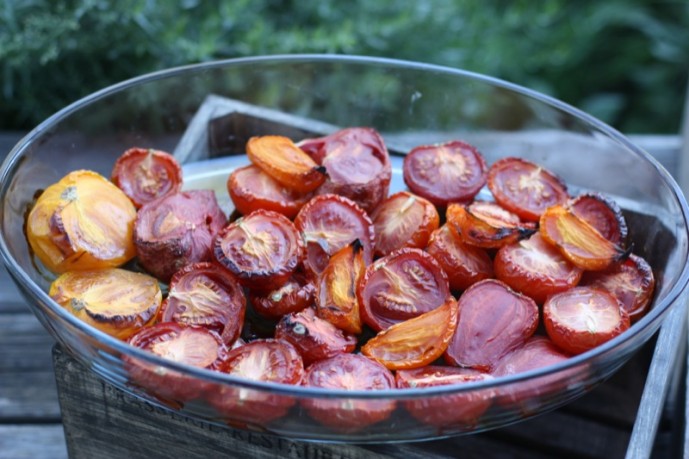 - Place under broiler and roast until charred (skin slightly blackened): about 5-10 minutes, turning once, to char evenly; I roasted the tomatoes for 5-6 hours first to get a denser flavour because I like that flavour, then did the charring for about 5 minutes on both sides