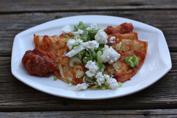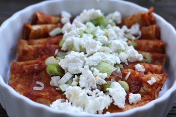 - Fold and arrange on plate or platter and spoon more sauce over the top (which I couldn’t do, it was too thick, so I placed it on the side); garnish with queso and sliced onions