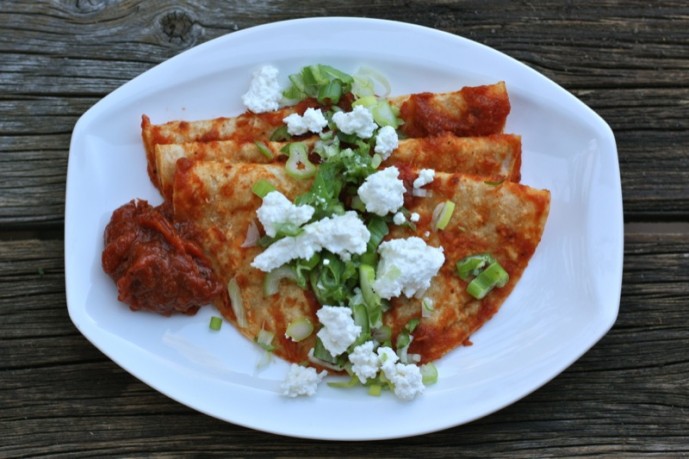 I do prefer them soft, but usually the sauce is on the inside when eaten as a wrap! As these are soft, and swathed in the tomato sauce, they need to be eaten with a knife and fork as do all enchiladas. Hmmmm… they are delicious, but there is a lot of corn in the tortillas, too. I think I am just missing the melted cheese over top. For my palate, a cornucopia of julienned raw vegetables hiding in the middle of each of these with melted Oaxaca would make it the perfect concoction.