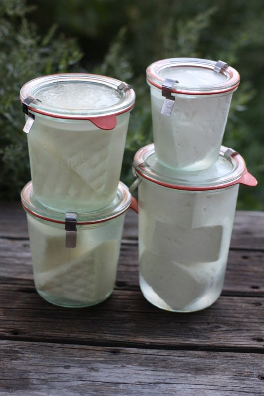 I can see how the recipe you followed is different from the one I used. On thing I like about the version I made is that I don’t have to use brine. The resulting cheese is not as salty, which I like. I love those glass jars of yours: I need to find some.