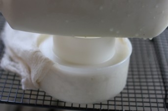 The cheese is then strained, curds placed in a 5 inch tomme mould (which fit perfectly with 6 litres of milk (almost 6 quarts) and pressed with an 8 pound weight, ensuring that the cheese is weighted evenly so a lop sided disc will not be the result.