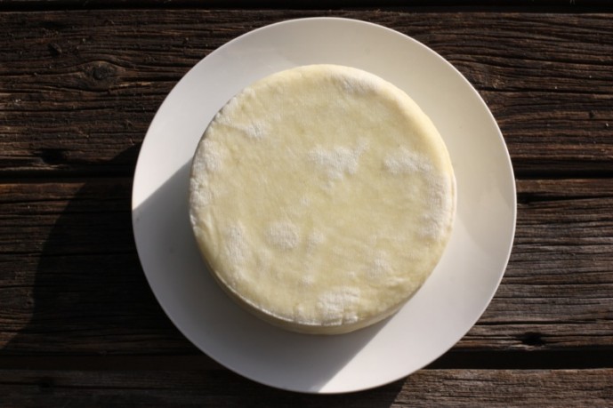 I was amazed at the texture and density of the cheese after 3 hours. After 6 hours it was too dark to take a good photo and I was too tired to continue, so the disc got wrapped in plastic and placed in the fridge overnight. See the white mold that has already started to grow on the new rind? The next morning, the cheese was cut into a square (“measure twice and cut once” is an old adage I should have adhered to!), and “cooked in its own brine. It never did float as I left it in one piece (an option) so took it out at 35 minutes and placed it on the mat, turning until the surface was dry on both sides. This really did not take long.