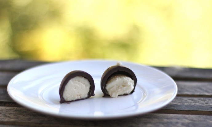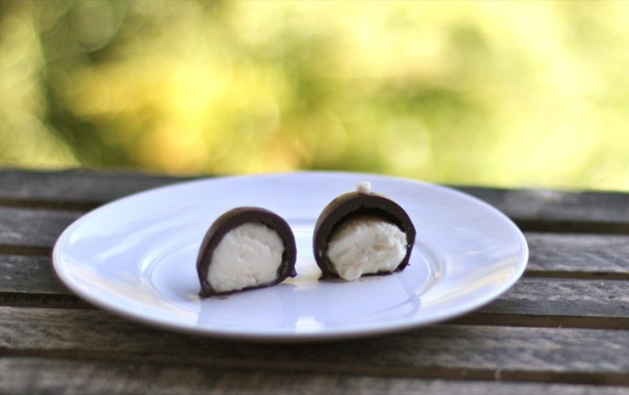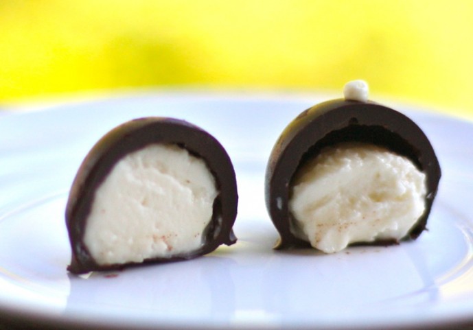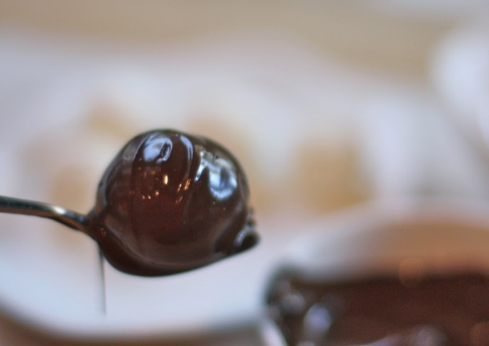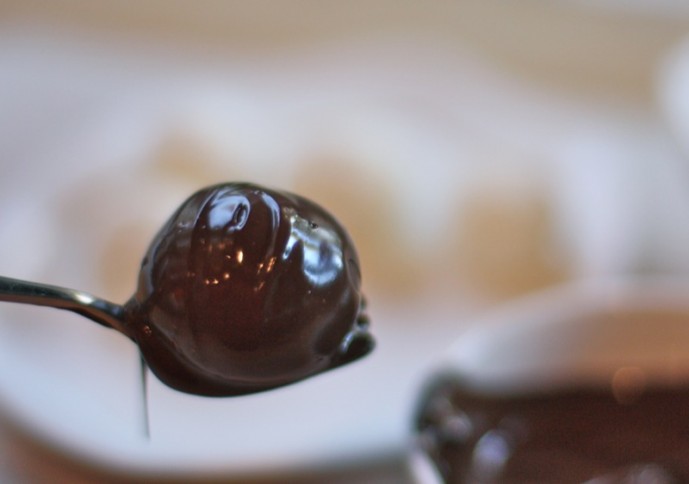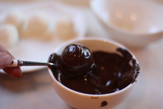 - When dipping, I use a small fork or a toothpick: as the balls are frozen (and must be) the chocolate must be quite warm or it will be too thick; you will need to use another instrument to clean the excess chocolate off of the bottom of the truffle, and slide it along the parchment paper, carefully, so there will not be a puddle of chocolate around it