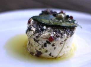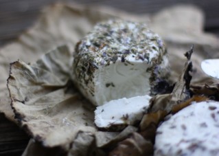 This was @Sailor_Rick’s first Tasting with us and his contributions were really creative! He brought four chèvres for the tasting all made from the same batch. The first, below, was a show stopper! It was formed in a mould and rolled in dried edible flowers that he bought from Dauphine’s. The flavour was a clean, very subtle goat chèvre and the texture was smooth and creamy. It was significantly different than the bowl of loose chevre curds he brought. That was also subtle, smooth, creamy and very fresh and bright, equally as delicious as the first, but different. The two grape leaf wrapped chèvres were equally surprising. The grape leaves came from his garden and were soaked in Sauvignon Blanc and then seared on his grill. One disc was covered in Herbs de Provence and the other with Lavender. Both tasted amazingly similar. It could have been because the grape leaf flavour took over, or because Herbs de Provence also has lavender in it, and there was less lavender on that cheese. Regardless, the flavour was not subtle. It was more tangy and complex. I didn’t care for the flavour of either, but appreciated the concept, loved the smoky leaf and the soft moist texture of these wrapped banons.