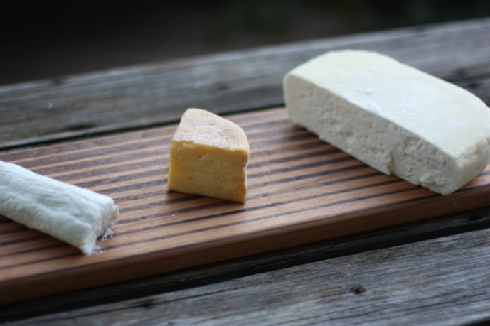 Ian brought three cheeses. He had never frozen a chèvre before and wanted to see how it changed the flavour and texture of that cheese. We were all amazed as the flavour and texture was delicious and very similar to the other chèvre’s au natural. He brought another Crescenza (he had brought one to our first Tasting) and had worked to get a rind on this one. The curd didn’t shatter on this one, like it did on his first, yet, the flavour was very similar to the first one. I preferred it without the rind, but I was in the minority. The star of the evening, at least to me, flavour-wise, was Ian’s Faux-ca. It is the orange cheese below. The texture was similar to a Parmesan, but it was slice-able and so lip-smacking yummy! Sharp and complex and a very addictive kind of stinky!