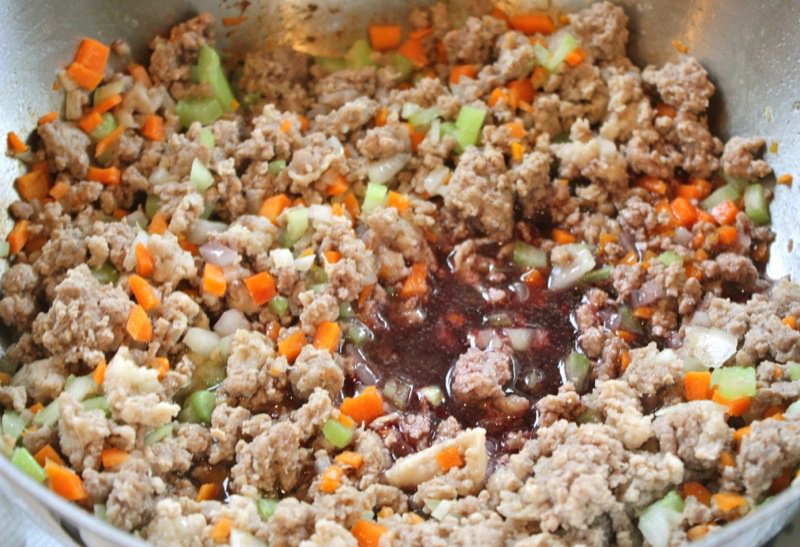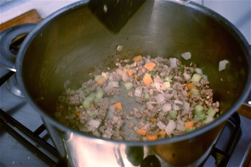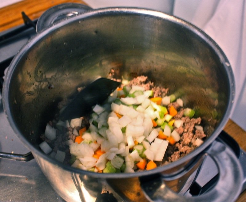 - Brown meats together in olive oil; add the vegetables and sauté a few minutes, stirring occasionally
