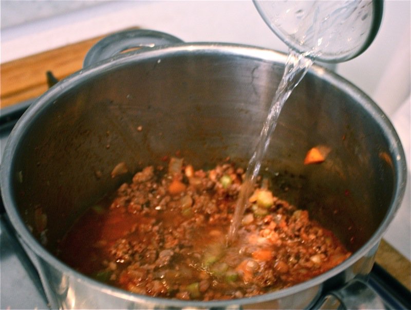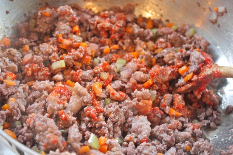 - When the meat is well browned, add the tomato paste or sauce and cover with water up to 1 cm above level of mixture