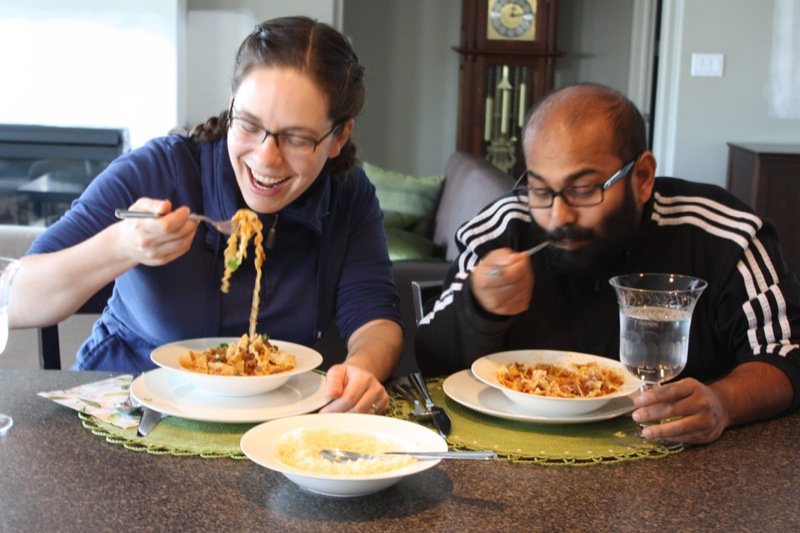 The five batch sauce with the bacon was the one served to my lunch guests and the tasting comparing the two sauces happened at dinner. Vanja “loved” them both, but found them very different from each other. The “Canadian” version was more complex and flavourful and the Bolognese version more subtle and delicate.