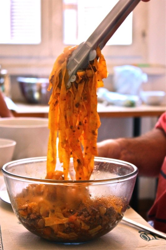 As the sauce was simmering, the pasta was ready to roll, and rest again, and cut. This was incredible pasta! The colour is this yellow as in this part of Italy, there are special pasta making eggs with a higher level of beta carotene. More information on this in my pasta post, but I can tell you that a good part of the Bolognese Sauce experience is the handmade pasta. By the way, this is the traditional sauce used for lasagne in this region, as well.