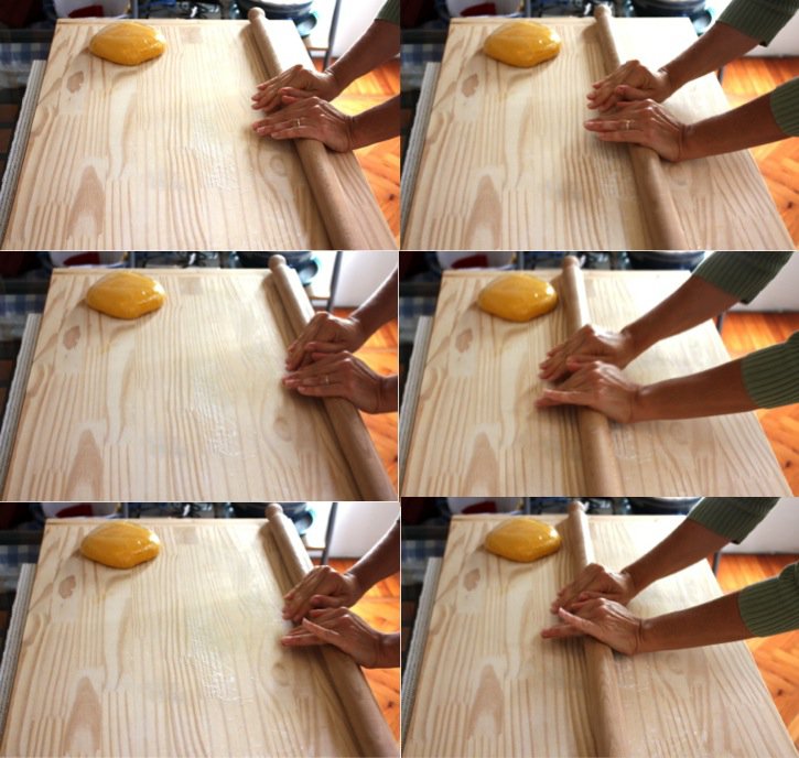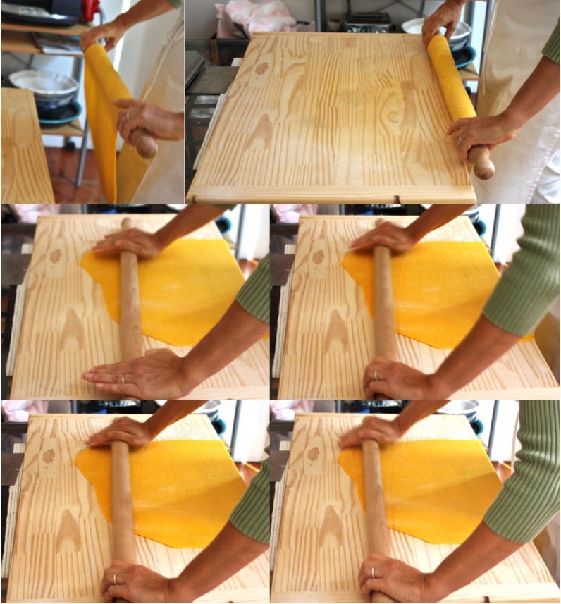 - Place the pin near the edge and use one hand only, if necessary, or two, but distribute the pressure on each hand according to the need of the pasta. Work through ensuring your edges are as flat and thin as the body of the sheet. If the piece is too big, cut it and move ½ and work with only ½.