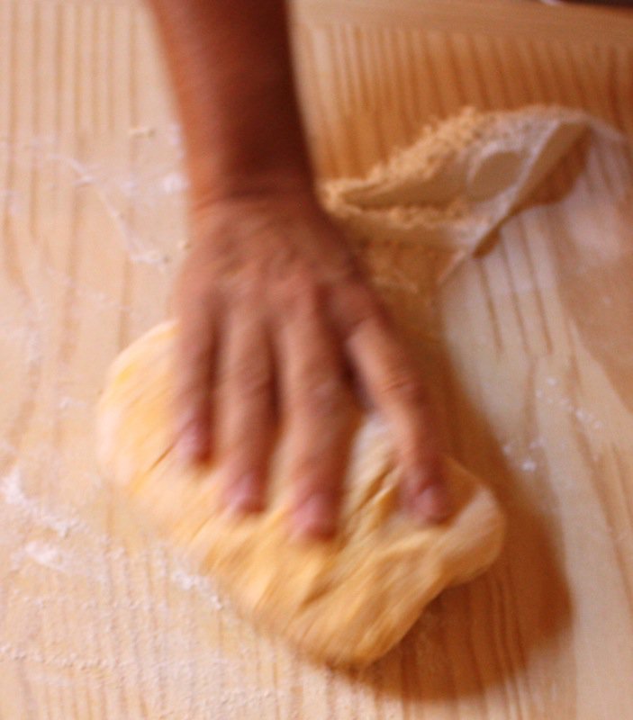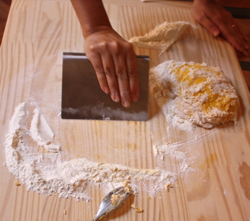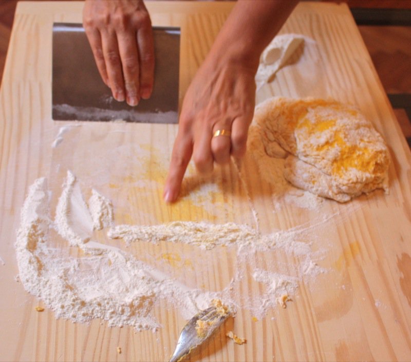 When almost all of the flour is incorporated, you need to start using the spatula. Move the “good” flour to the side; scoop up the pasta and set it aside, then clean the sticky “gunk” from the pasta board and place it to the side. You do not want these dry or hard bits worked into the beautiful tender dough. Then, start incorporating the good flour, using the spatula, as you see below, through a folding knead, just until the pasta is dough is no longer sticky. There may be some “good” flour left over. Remember that the only variable in the measurement of these two ingredients is the size of the eggs. This is the time you compensate for that through this process. Remember, there is no rush. Maribel was clear about that: slowly, slowly…. slowly.