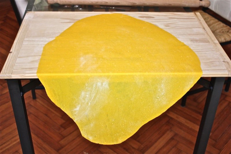 When the dough is thin enough to read through, or as the Bolognese say, “The pasta is thin enough when it is held in the window and one can see San Luca Basilica through it.”, it is time to work on the edges.