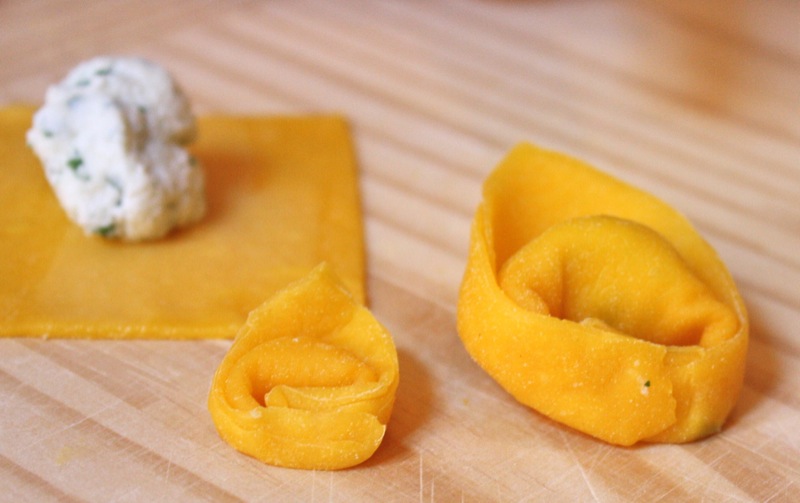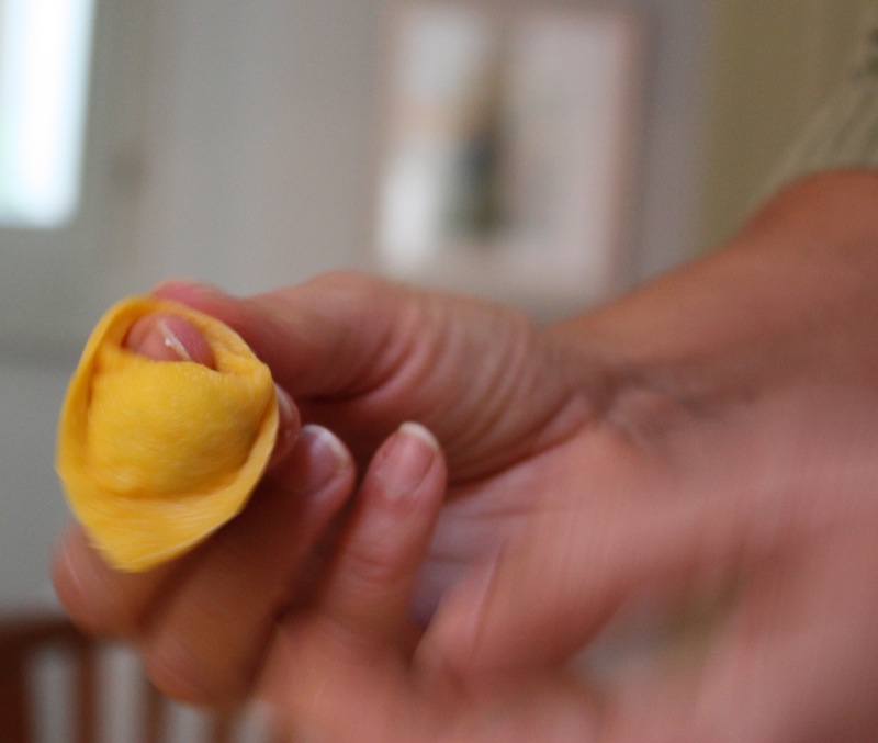 Interestingly, what we call Tortellini in North America is actually tortelloni. Tortellini is a true specialty as it is so very tiny and incredibly labour intensive to make. Below, Mirabel demonstrates the difference between tortellini and torelloni using a little ball of pasta dough as the filling for the tortellini. You can see the difference in the size of the square and understand why these are such a labour of love!