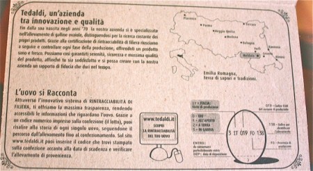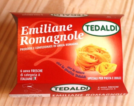 Marina introduced me to the simple, yet very special, local ingredients used to make this world famous pasta: 100g 00 flour to 1 egg is the correct portion per person when making hand rolled pasta for a meal. The eggs are specially raised in the region for pasta making as the yolk must be very high in beta carotene and a dark yellow, or orange colour, to create the characteristic golden pasta colour the region is famous for. Below, left, is the box for pasta making eggs. You will see that each egg has a stamp on it. That is because every egg from every farm in the country is stamped so that the farm the egg came from can be identified. Italian people care about where their food comes from and know which farm it comes from, even if they buy it from a supermarket. The information below, inside of the egg carton, identifies the exact region and farm the eggs have come from.