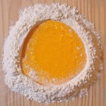 Above, see how the fork was used to widen the flour well and heighten the walls to enable the eggs and flour to be carefully incorporated without breaking through the flour wall. (Compare the photo directly above to the one above it.) Using a fork, slowly mix the eggs together. There is no rush. Mix, or whip, the eggs until completely combined and then slowly, slowly, slowly incorporate a little flour as you stir. Fully incorporate each new addition of flour before you introduce more into the mix.