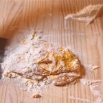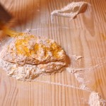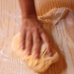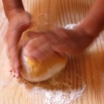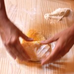 Add only enough flour to have the mixture feel like a soft play dough. Dust with a wisp of flour under the board and on the ball: flatten and fold gently to the middle. Do not press hard or you may tear the gluten threads; fold, push gently, ¼ turn, fold, push gently, ¼ turn etc…