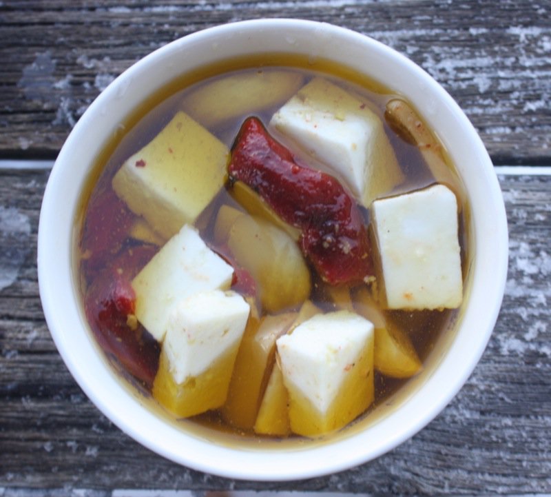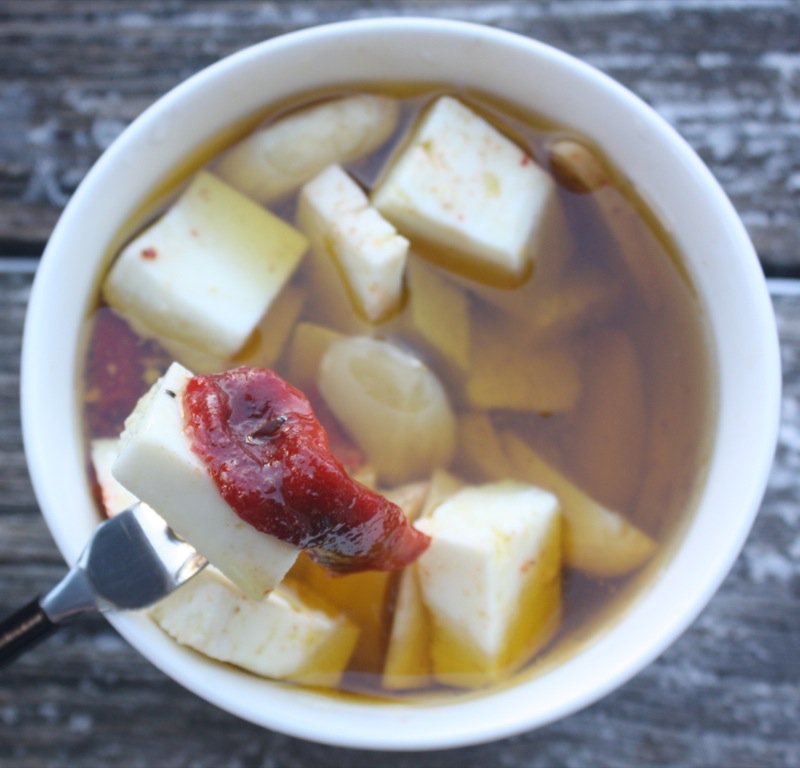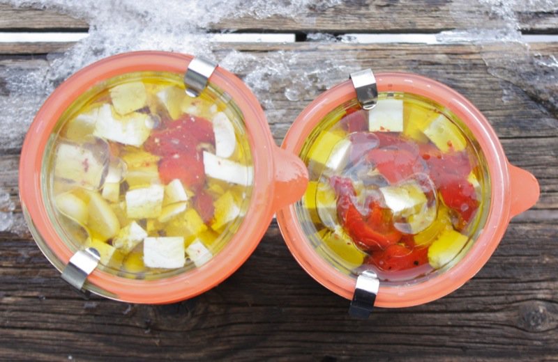 Three of my favourite foods: roasted red peppers, garlic, and feta. I would have never thought of adding the roasted peppers and they make all the difference. Ian gave me a small bottle of this and I loved it. So, I am paying it forward and sharing his recipe! Great for gift giving and you don’t even have to make your own cheese! I would definitely recommend roasting your own peppers, though! Just in time for the holiday season! Thank you, Ian!