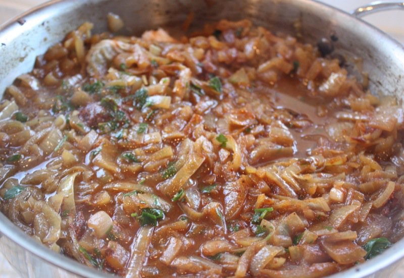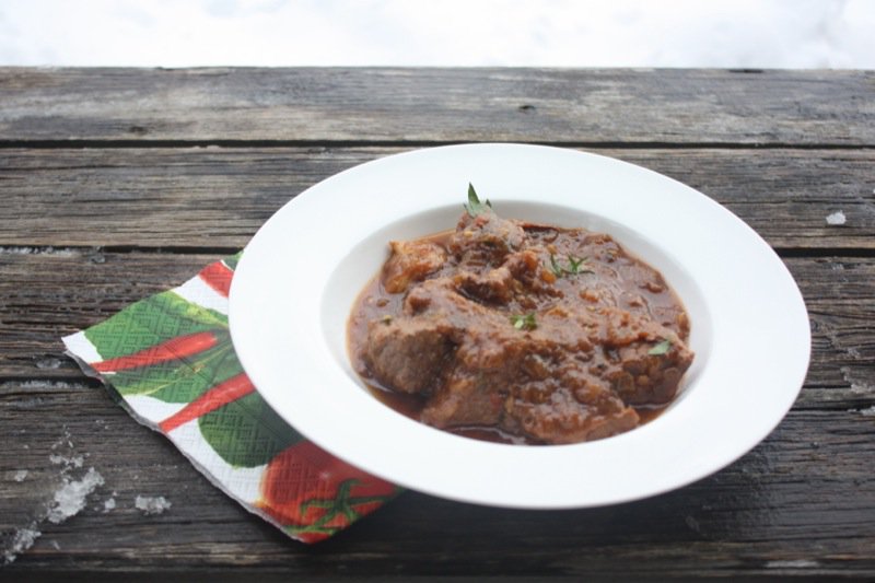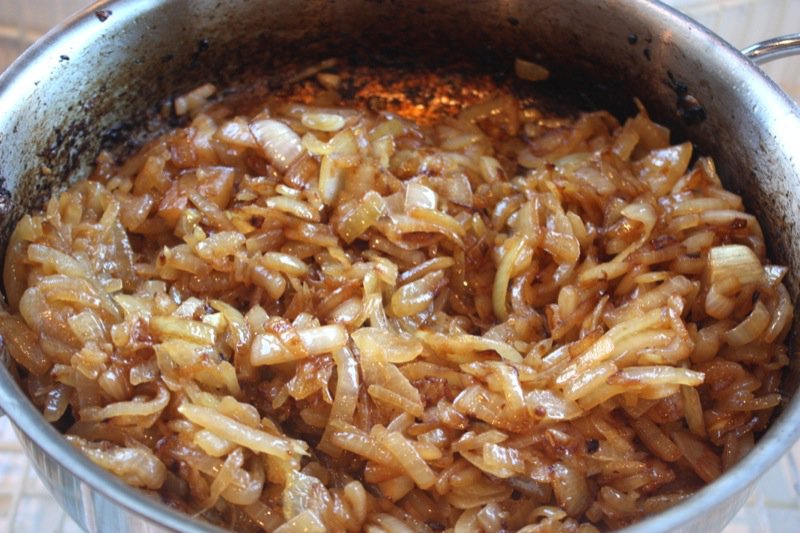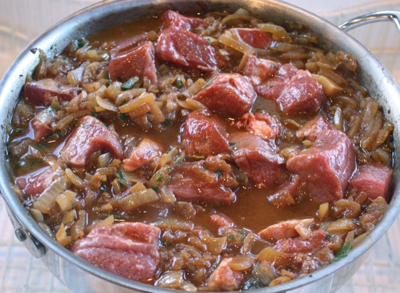 I used round steak from Nature’s Green Acres Nouveau Beef. Vanja’s mother would buy a piece of meat from her butcher of the cow that is worked hard and cook it down low and slow. It is all about the flavour driven by frugality. Most people have pork in their freezers and buy beefs from the butcher. This is a poor country, but this is a country where the people eat very well because they know how to make everything from scratch and are very good at it. This aspect of the culture has changed dramatically in the cities the past 10 years, but it remains the same in the countryside. The meat is not browned first, but the onions are caramelized which sets the rich foundation for this flavourful stew. I made a double batch, but caramelized the onions in two batches.