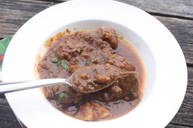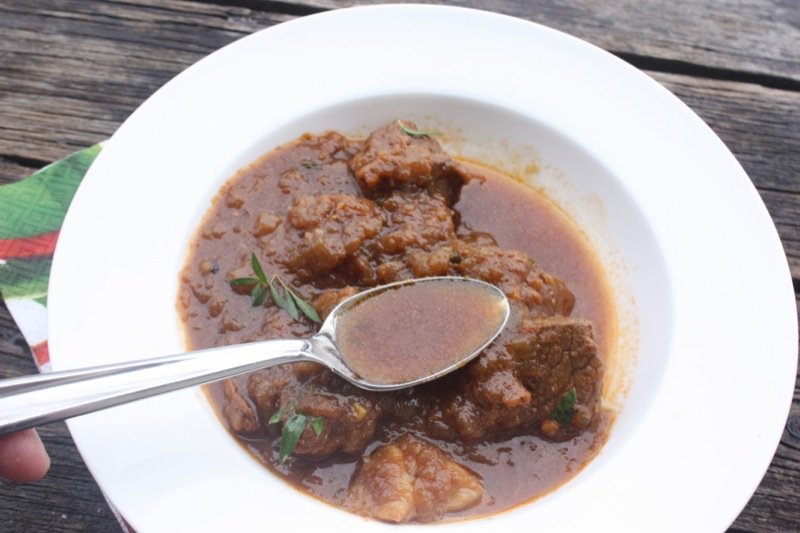 This evening, we are having our dear family friend, Vanja to dinner. Yes, there is another Vanja. The sun is going down, so the tomato juice is added now as we will be eating shortly, but the rest of the pictures will be taken tomorrow when the sun is up again! The intensity of the colour of this stew surprised me. The flavour is lovely, and after the tomato juice was added, the acid made a significant difference to balancing the overall flavour, but I could not discern any tomato flavour, per se.