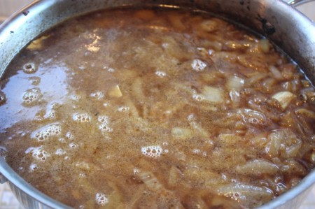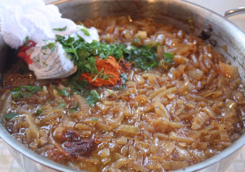 - Sauté onion in the oil, once caramelized, cover with water and simmer for 20 minutes