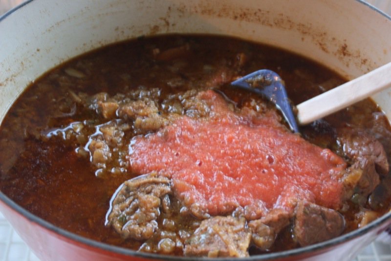 Chunks of meat are added into the mix and all is once again covered with water and simmered. This is the point where simmering for a long time is really important when you have a tough cut of meat. You can see my pan is now too full, and I need to transfer the goods to a larger pot for this part of the process.