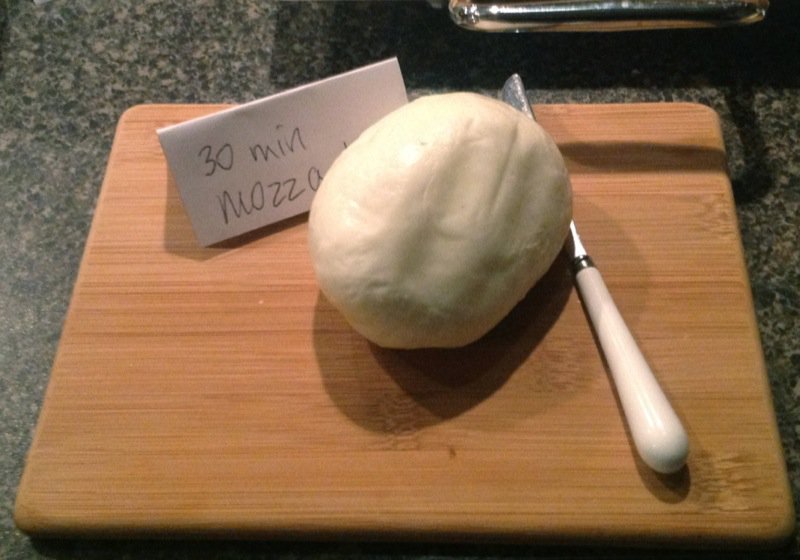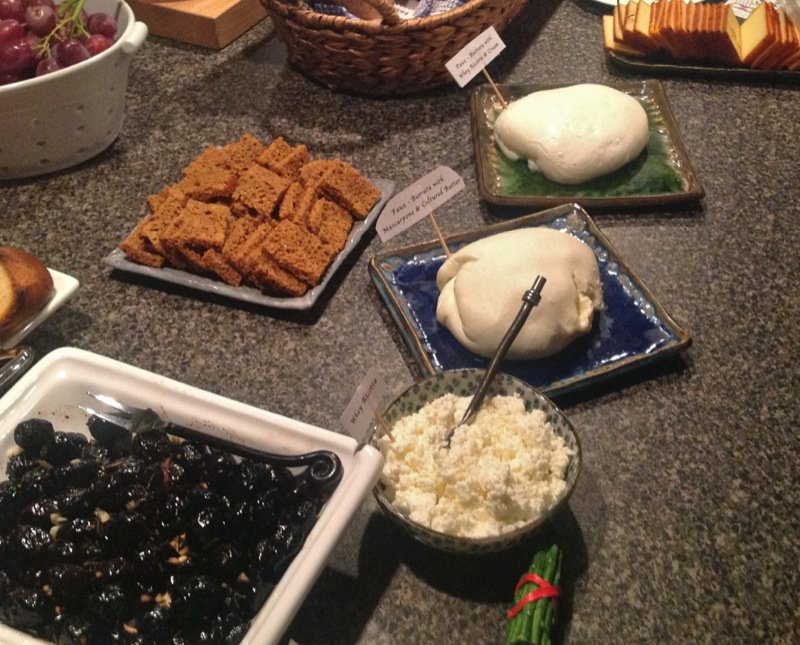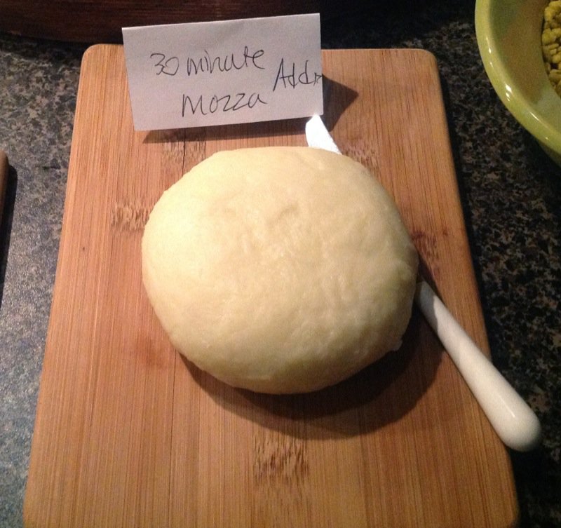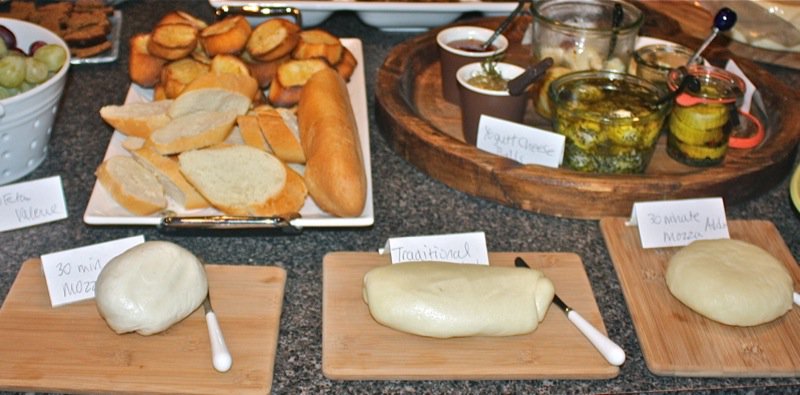 Theoretically, this was a mozzarella tasting. Deb, Addie and I got together the Sunday prior to “whip up” some Mozzarella for the Tasting. Far left, below, 30 minute mozza made 5 days prior, still very good. Not for long, though. In the middle, Traditional Mozzarella made by Deb and stretched just before the tasting by moi. To the right, another 30 minute mozza that was definitely edible, but the citric acid was put in at the wrong time.