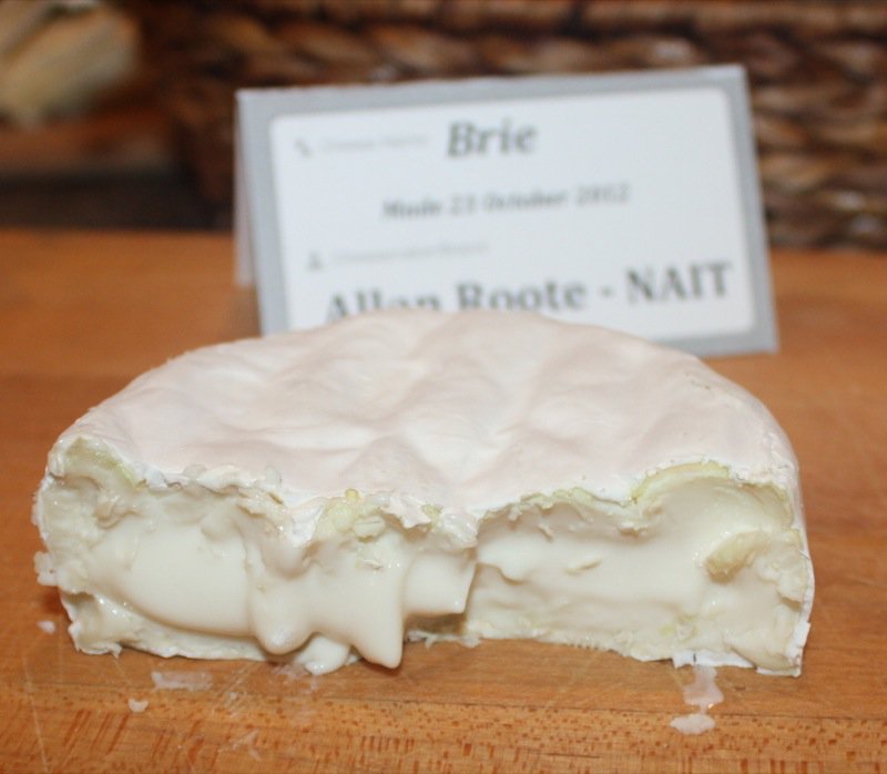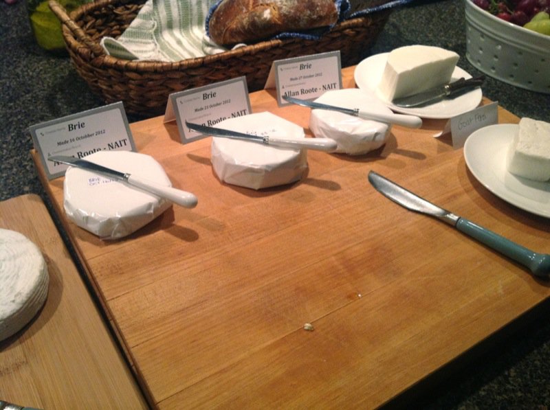 Nigel Webber and Allan Route from our local and renown Culinary Arts Program at NAIT, make cheese. NAIT Culinary Arts will be offering a full fledged cheese making program very soon which I will be attending! We were hoping to get some NAIT students involved in this project, but Allan and Nigel are definitely interested and have not yet been able to attend a tasting. However, this time offered us three of their homemade brie, each made at different times, which provided a lot of fun for a little brie tasting session! Ian labelled and dated each.