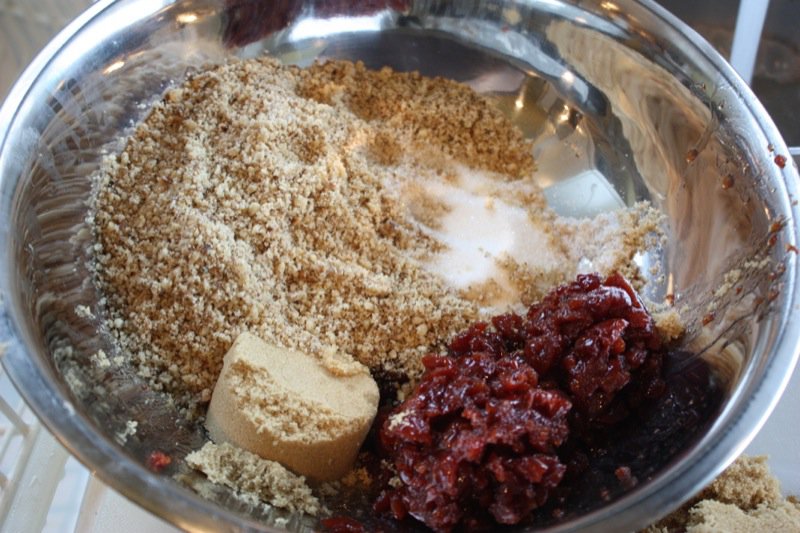 These gorgeous preserves are not showcased in this cookie. You would never guess they were in it as the filling combination comes together to create a new “somethin’ somethin'” that begs the question: “What is in this filling?” So, they do make all the difference. It was actually a little hard for me to chop them up, as they are so beautiful whole. Fragrant toasted walnuts, freshly ground, with two sugars and the cherries is all she wrote. That is it.