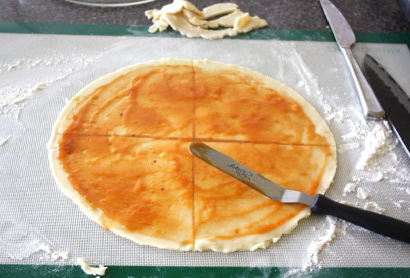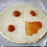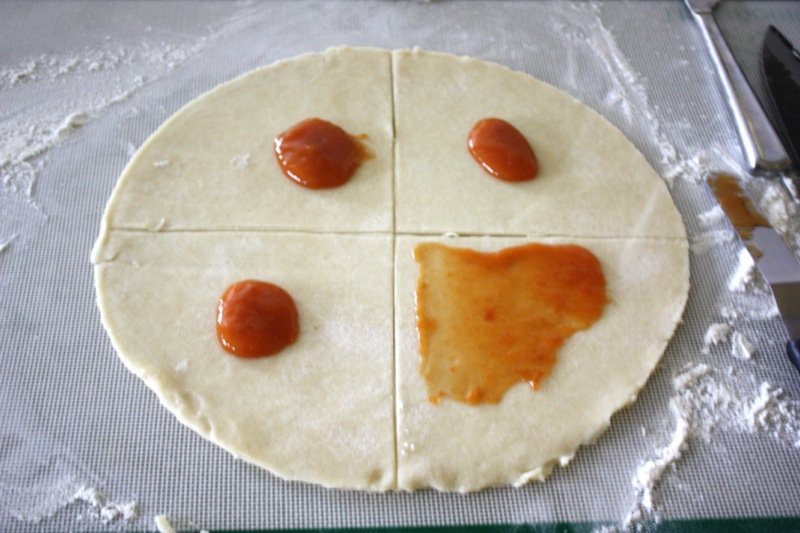 - On a floured board, roll each portion of dough into a 9 inch circle; spread each with 2 Tablespoons of strained apricot preserves using a small off set spatula