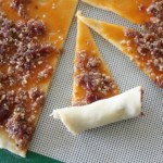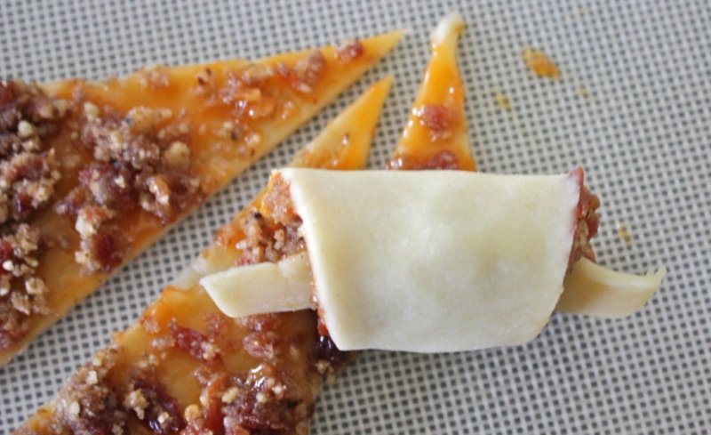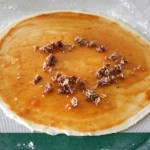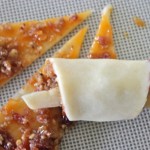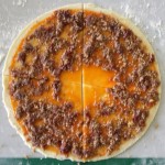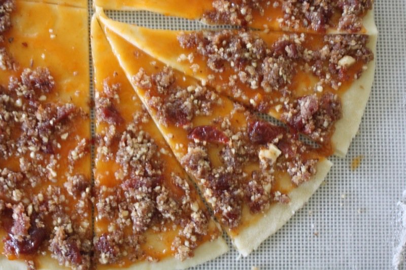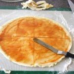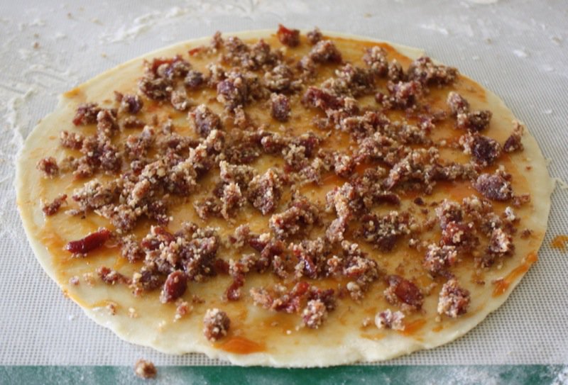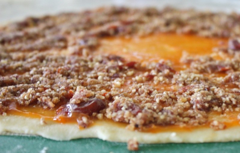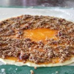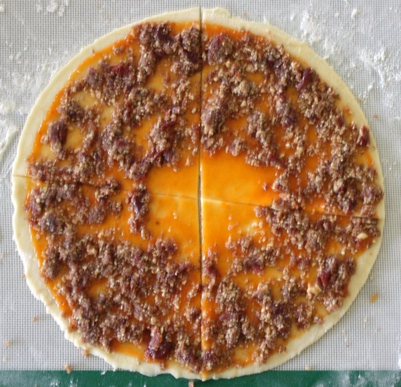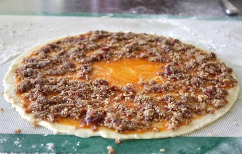 The filling must be evenly divided into four portions and set aside while one round of dough, earlier portioned into four, is rolled into a nine inch round. I portioned quarters a bit prematurely. It didn’t seem to make a difference, but I didn’t do it with the remaining three rounds. I did try to portion my ingredients per quadrant. Two tablespoons of homemade apricot preserve per disc of pastry spread with an off set spatula; the filling sprinkled over that. I also had the idea of not adding filling onto the point to avoid spillage (and mess), but noted that the jam seemed to run, anyway, so filled the centres of the remaining discs. The difference was indiscernible.