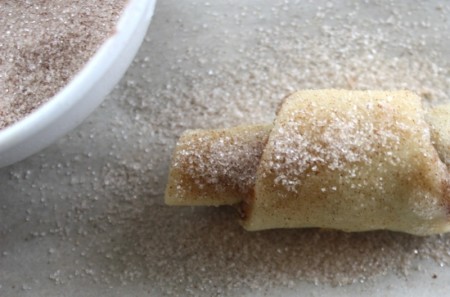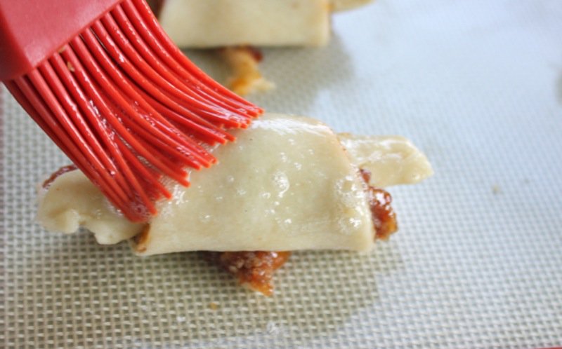 - Starting with the wide edge, roll up each cookie, placing point tucked under on the parchment lined baking sheet