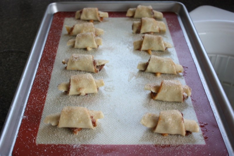 Each quadrant is cut first, then divided into three equal portions. Each disc makes 12 cookies, thus the recipe makes 48 cookies. Just the right amount for the holidays! After sprinkling on the filling remember to push it gently into the dough. This is important to avoid mess and spillage. I was very impressed with the consistency of this filling and with the workability of this lovely dough. These rolled up effortlessly and were set in the fridge to cool for 30 minutes before sugaring and baking.