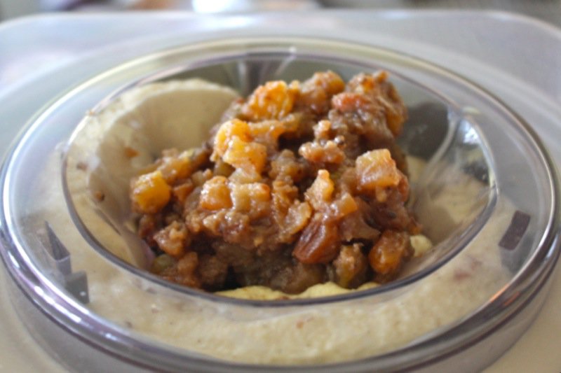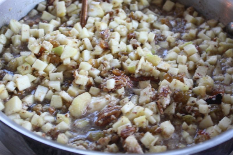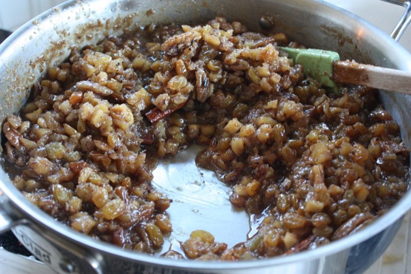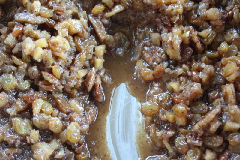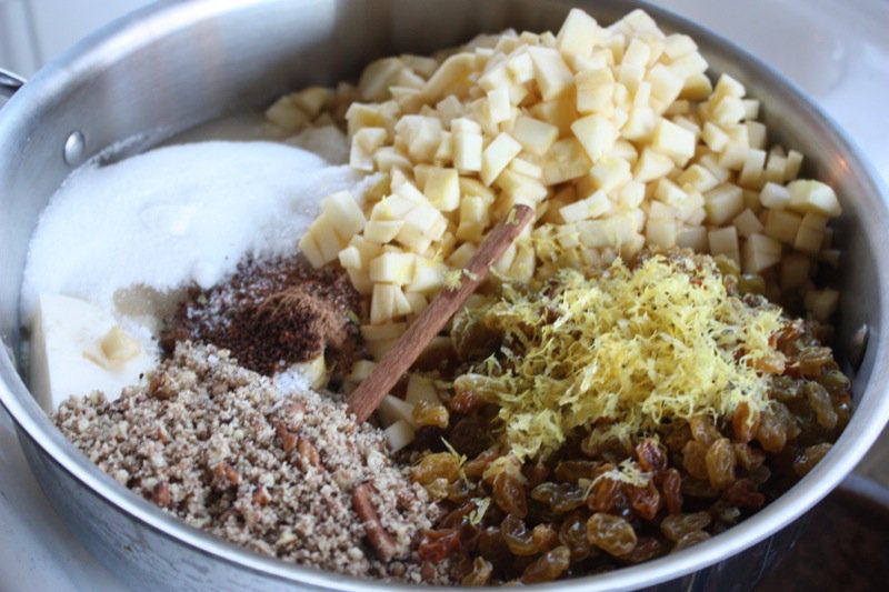 Make the vanilla ice cream, first. Plop it into the fridge and then whip up this easy-peasy little batch of aromatic appley mincemeat without the traditional suet or meat: raisins, sweet diced apples, lemon zest and juice, homemade apple juice, Calvados, (or homemade Pommette), sugar and cinnamon, nutmeg and cloves. Mmmm. There will definitely be Christmas in the air, and you will find yourself singing silly little Christmas ditties as you stir these ingredients into caramelized submission.