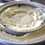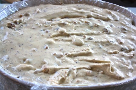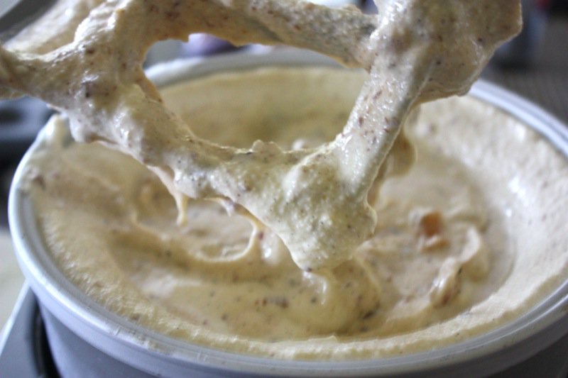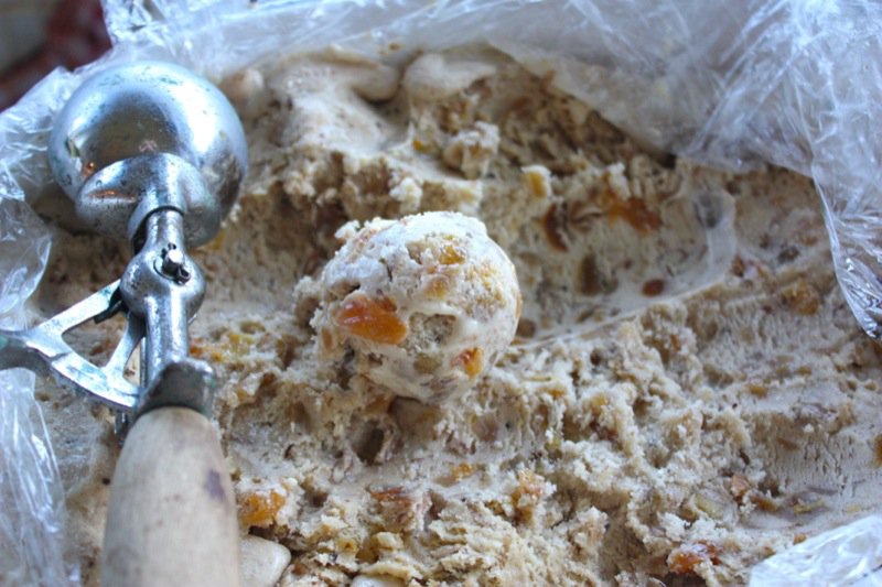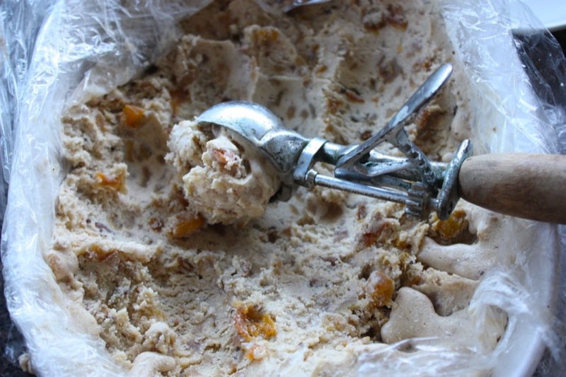 Above, it is extremely thick and cold and ready for the freezer. This batch is also ready for the freezer, below. Both consistencies work well. I find that covering a container with plastic wrap makes it easier for me to get the ice cream out of the container. Below, where you see the scooping photos, are the most authentic colours of this ice cream: warmly jeweled and fragrant with the flavours of the season!