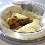 When thicker than a milkshake, as above, add the ice-cold mincemeat. You might even stick it in the freezer for the twenty to thirty minutes the ice cream will take to get to this stage. Remove the cinnamon sticks and add the three cups into the bowl, if you have the 2 litre sized bowl, slowly, with the machine still on until completely combined. Continue to mix for 5 more minutes.