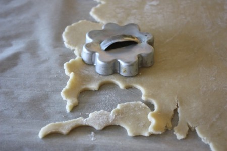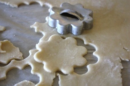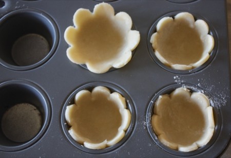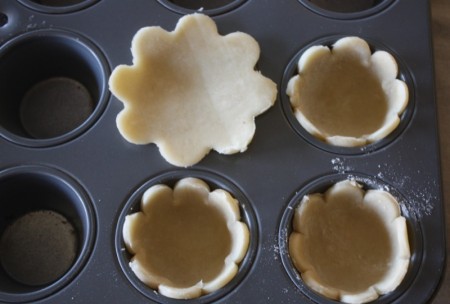- Use a flower shaped cookie cutter to create a lovely tart edge; tuck each tart cutting into the miniature tin to create the shell (never butter or flour tins when making pastry shells)