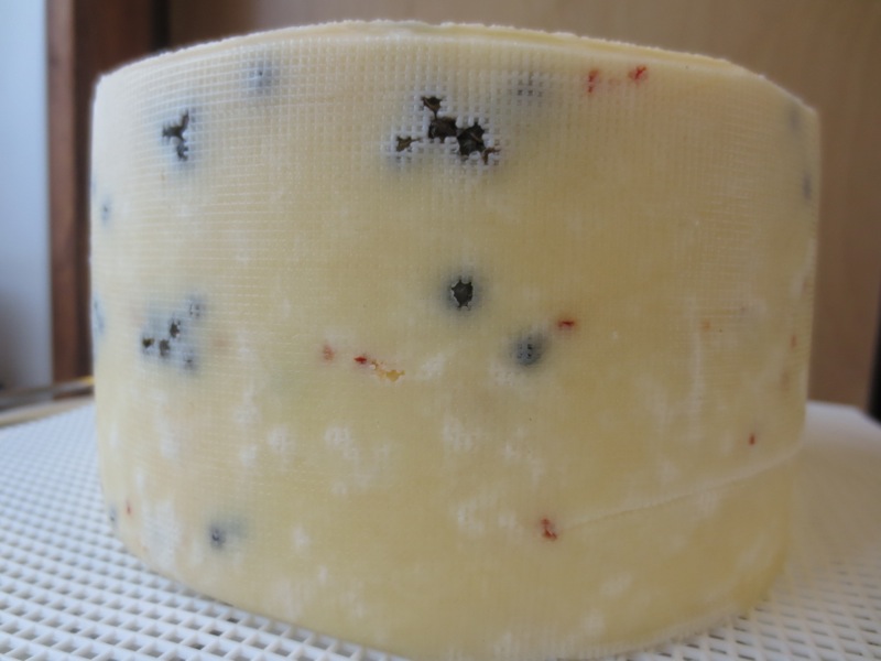 Ntala at Crazy Mare Ranch from Barrhead Alberta makes incredible cheese. I know. I have tasted many of her artisan triumphs. I cannot wait to taste this one. I hope I am lucky enough. It looks like there are various peppers bejeweling this lovely round.