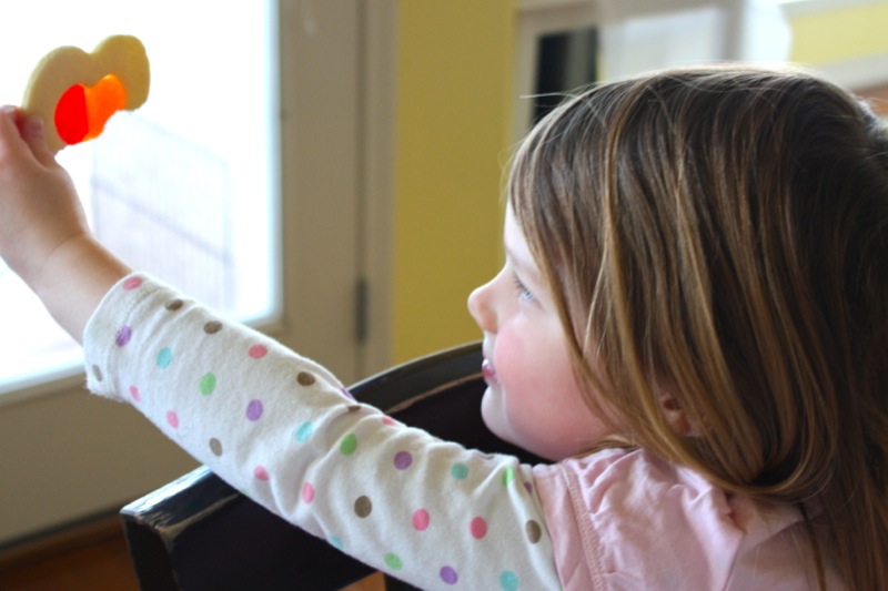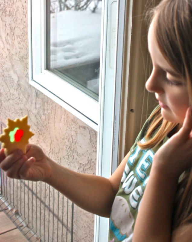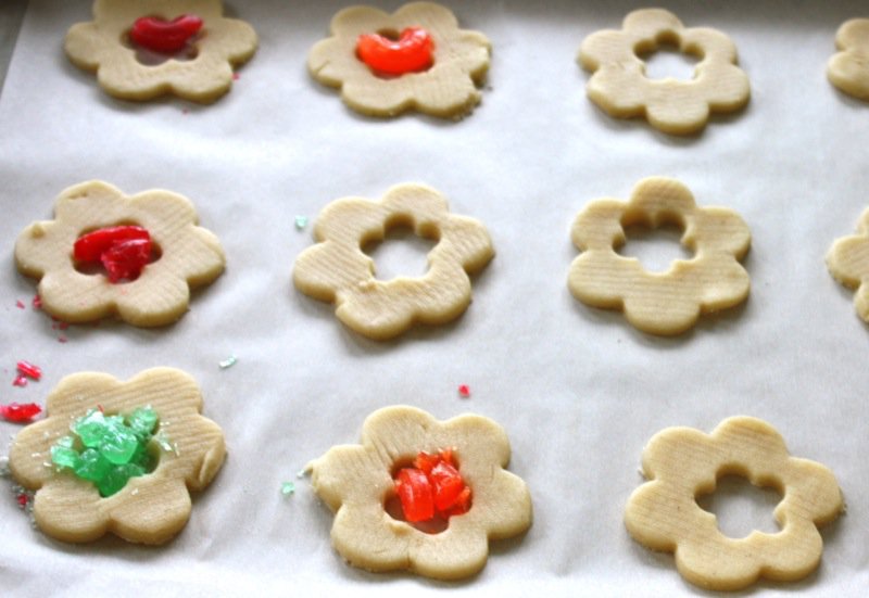 - Break each color of candy separately, if necessary, and spoon inside centers of cutouts