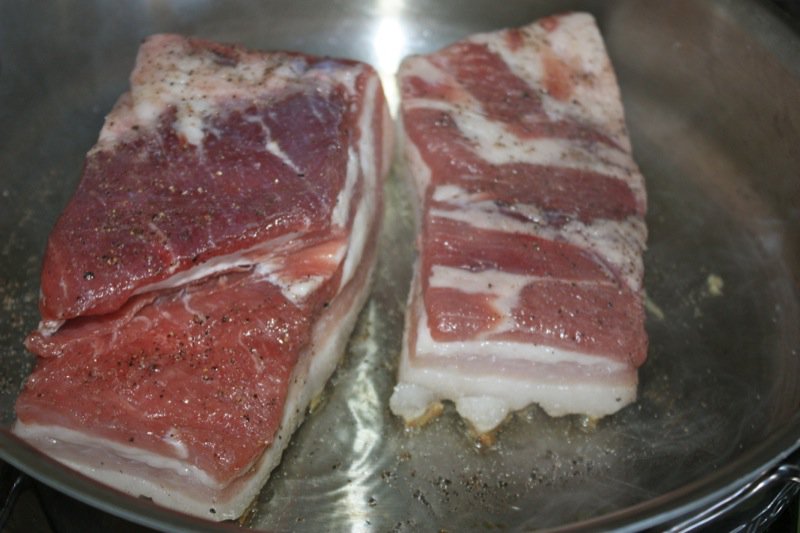 Corey came over to teach me some of his insights for my website and blog posts as well as to cook with me. We had a blast cooking a great meal, but never got to the technology. Cooking together will do that. It is just so much fun! He wanted to make some pork belly for part of the meal. I happen to have a half a Tamworth Pig in my freezer, so out came some pork belly. Hmmm… he forgot his recipe. No matter.