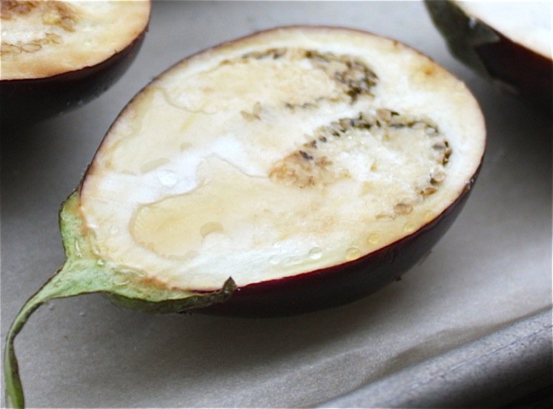 - 6 small Indian eggplant (normally just a few inches long, shaped like an egg), halved