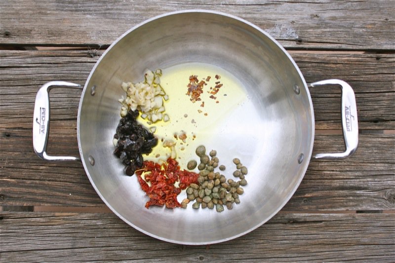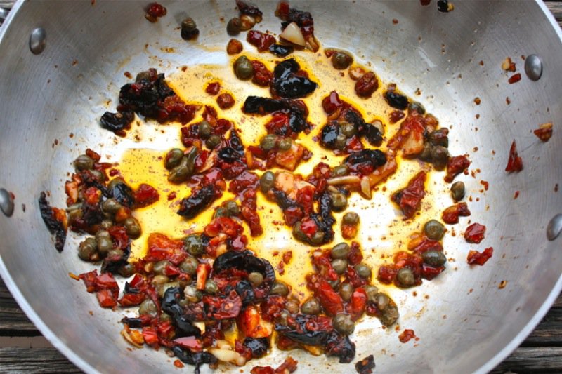 Letizia used the ingredients I am using. Just a little goes a long way: beautiful salt-packed capers, sundried tomatoes, garlic, black dried olives, red pepper flakes and gorgeous creamy toasted pinenuts (to be added later). These are fried quickly in a bit of fruity Umbrian olive oil, then a bit of tomato paste is added to the mix.