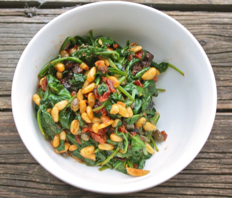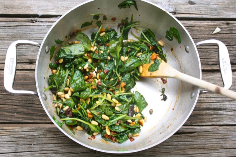 - Add spinach, and stir to wilt; toss in the pinenuts and stir