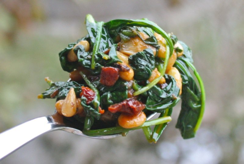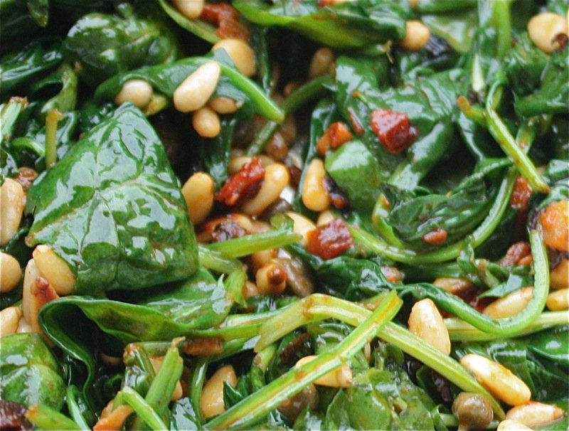 I adore the tender leaves of vitamin and mineral rich spinach. I piled the steaming pot high with the leaves as Letizia did with the kale, stirring just a couple of minutes to wilt them. Once wilted, the pinenuts are tossed into the mix, and, voilà – rather velato! The vegetable mixture c’est fini – è tutto finito!