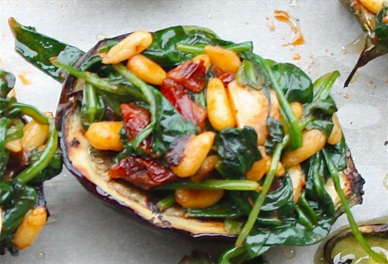 - Top each eggplant half with one twelfth of the vegetable mixture in an oven proof baking dish