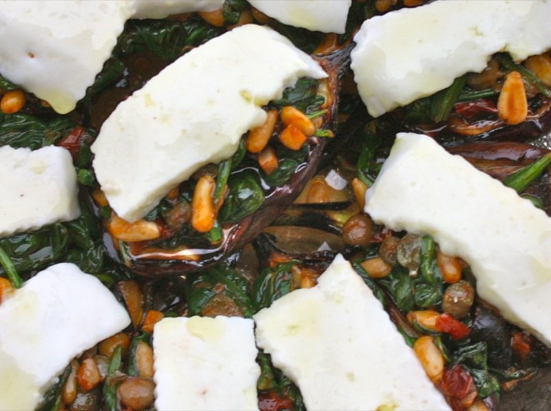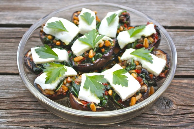 - Just before serving, place stuffed eggplant into the pre-heated oven, tented with foil for 20 minutes, or until hot, bubbly and the cheese has melted