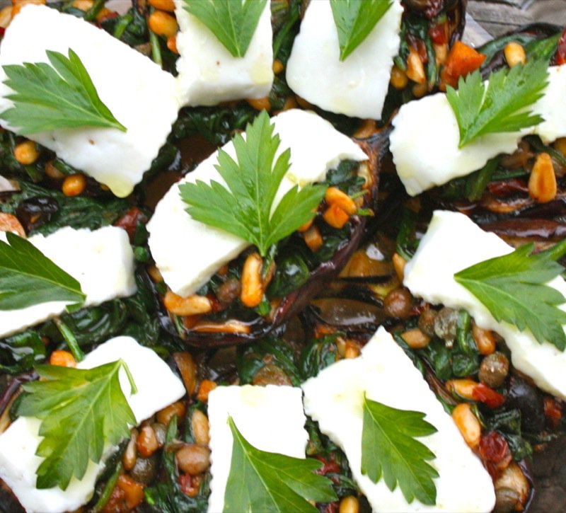 We stayed with Letizia at the end of August 2011 at her agritorismo and I took a cooking class our last morning there, before we headed into Firenze. It began with an inspirational Taste of Terrior at a little shop down the winding road from Monte Subasio to the nearby village of Santa Maria degli Angeli at the foot of Assisi. We purchased foods from the tasting and returned to cook a lovely rustic meal together. (Which I believed I would have posted long ago.) One of the dishes Letizia demonstrated was so similar to this recipe. She used kale and then placed little mounds of the mixture on a local Assisi flatbread. Spying the sapphire globes in the market, I immediately visualized mounds of the flavourful rustic vegetable mixture on top of each smoky grilled vessel.
